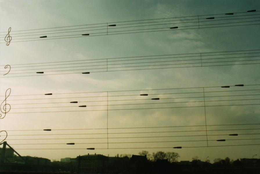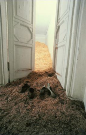 1. Dmitry Gutov, Shostakovich - in memory of Sollertinsky, 1993, wire and rifle cartridges, 200 x 370 cm.