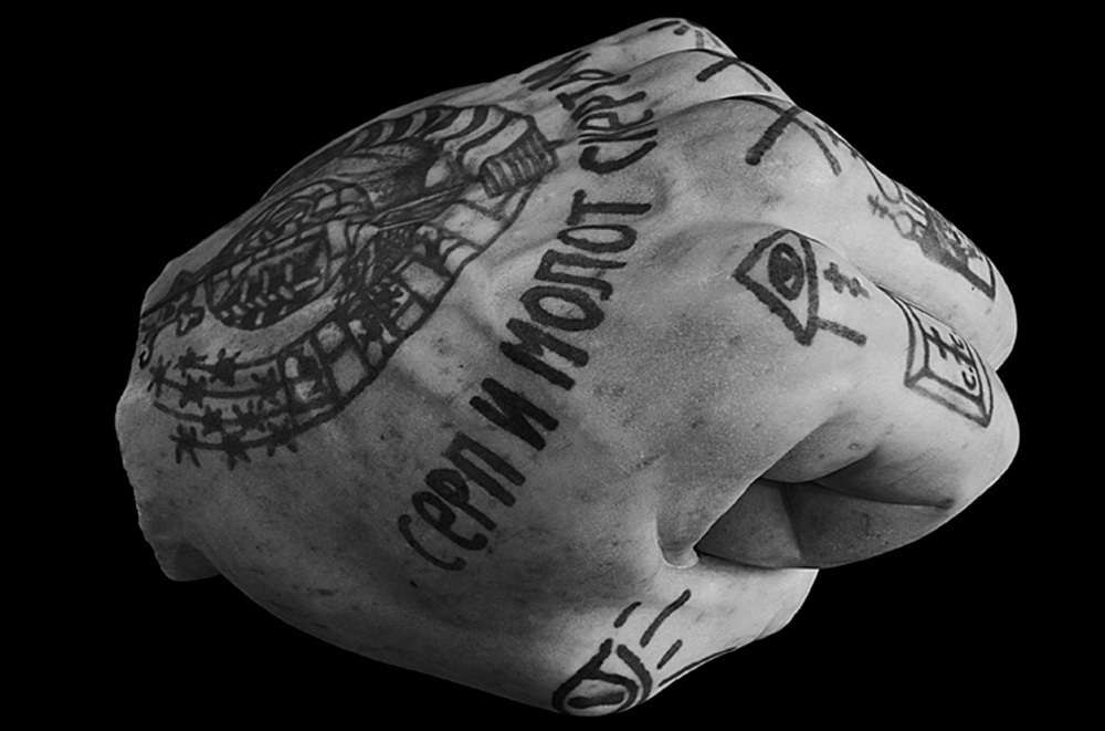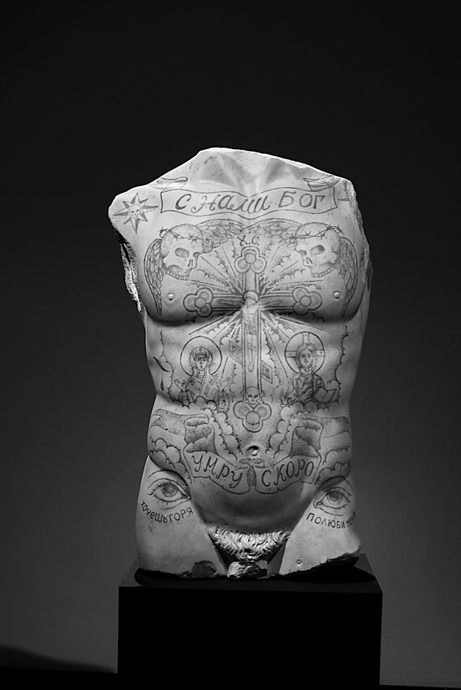 History and memory are further explored in Viale’s works, Yours will be Ours, Souvenir, David and Kuros. He creates sculptures from fragments of historically important and famous statues, such as Michelangelo’s David and the torso of the ancient god, Kuros, which are then covered in ‘tattoos’. These ‘tattoos’, inspired by a trip to Russia, are indicative of labor camp and prison tattoo designs, featuring inscriptions like ‘God is with Us’, ‘I’ll Die Soon’, ‘The Sickle and the Hammer’, as well as winged skulls, the Golitha, the cross and other religious and mythic symbols.