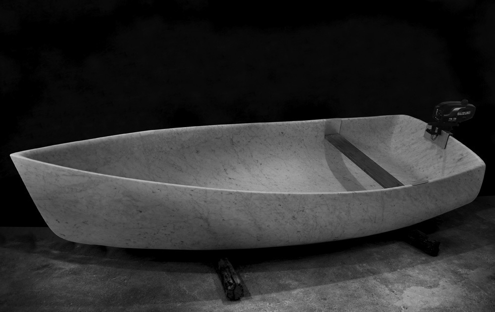 He challenges the formal preconceptions of sculpture by presenting the classic material of marble as hyper-realistic tattooed body parts, boats, paper airplanes or tires.