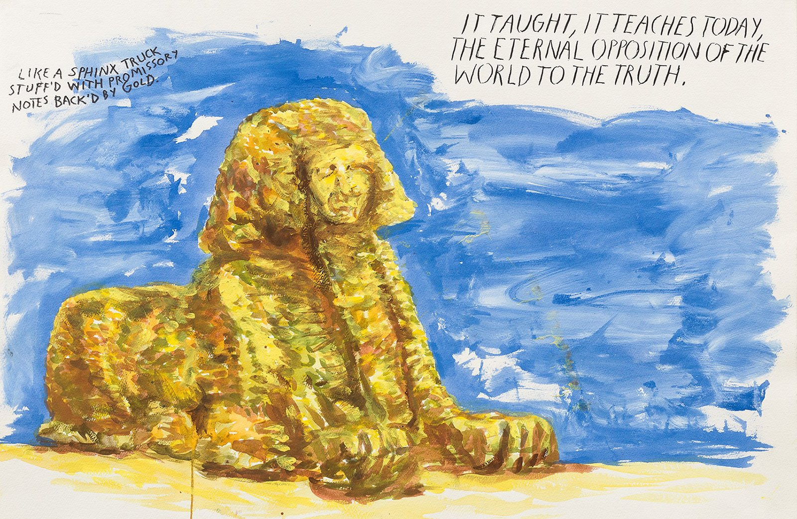 […] More than write it, Pettibon draws and paints text. Rare exceptions aside, language must come out, like the pictures, in his own hand. Handwriting expresses the timbre, pitch, and mood of voice; font and graphological style capture personality and identity.
