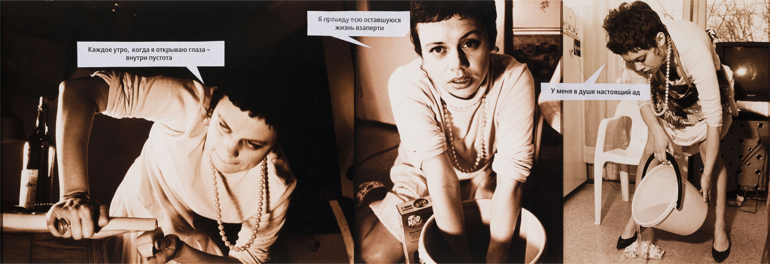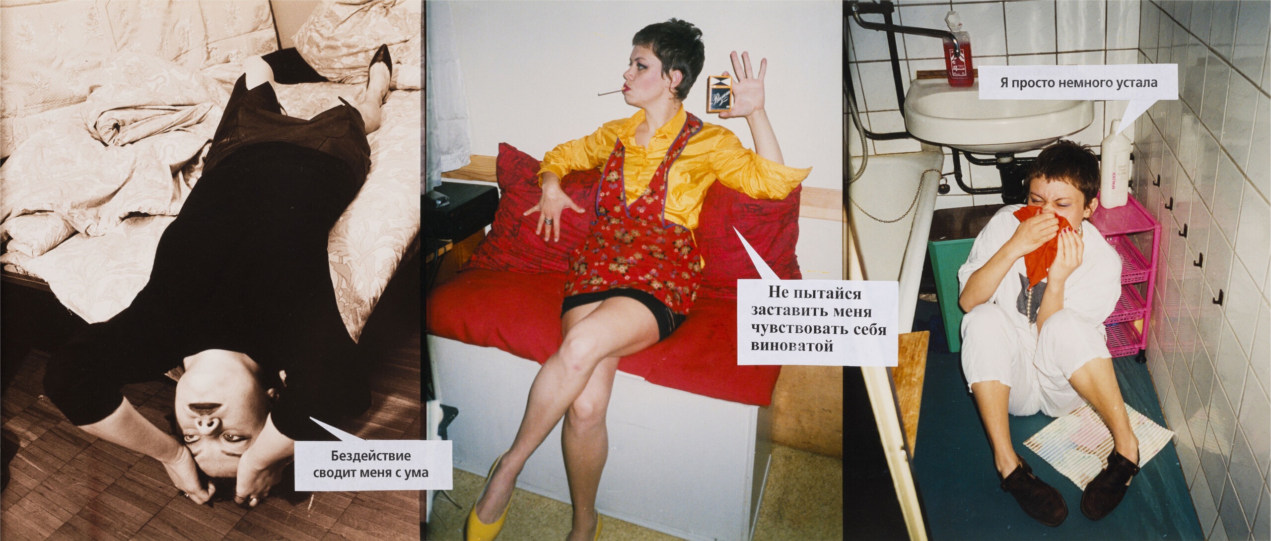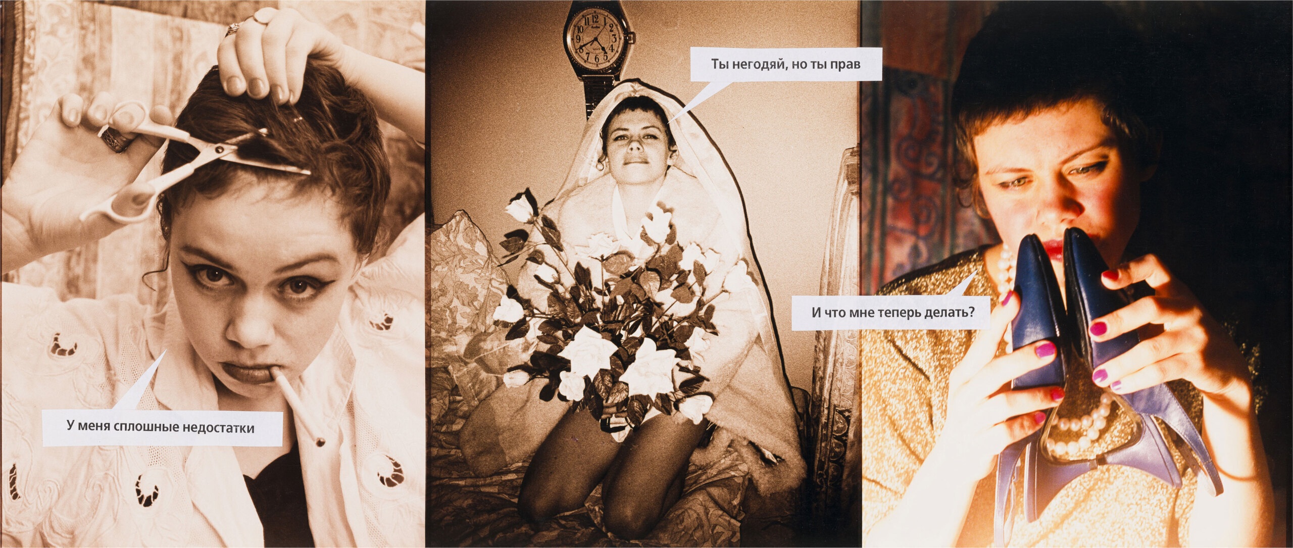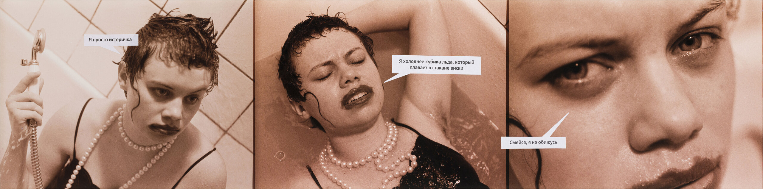 Горлова деконструирует формат с его наигранно-документальным натурализмом. В кадре — «трепетная девушка на грани нервного срыва»: мокрые волосы, размазанная помада, вечернее платье и жемчуг. Каждое изображение сопровождается репликой героинь «Страны любви» — «хоть я тебя и ненавижу, сейчас я нуждаюсь в твоей нежности», «я просто немного устала», «смейся, я не обижусь» и т. п. Рассогласование текста и визуального ряда высвечивает механизмы формирования желаний, «правильного» поведения и производства женской субъектности. Псевдоэмансипаторное «я сама» соседствует с самообвинением («я просто истеричка»),
