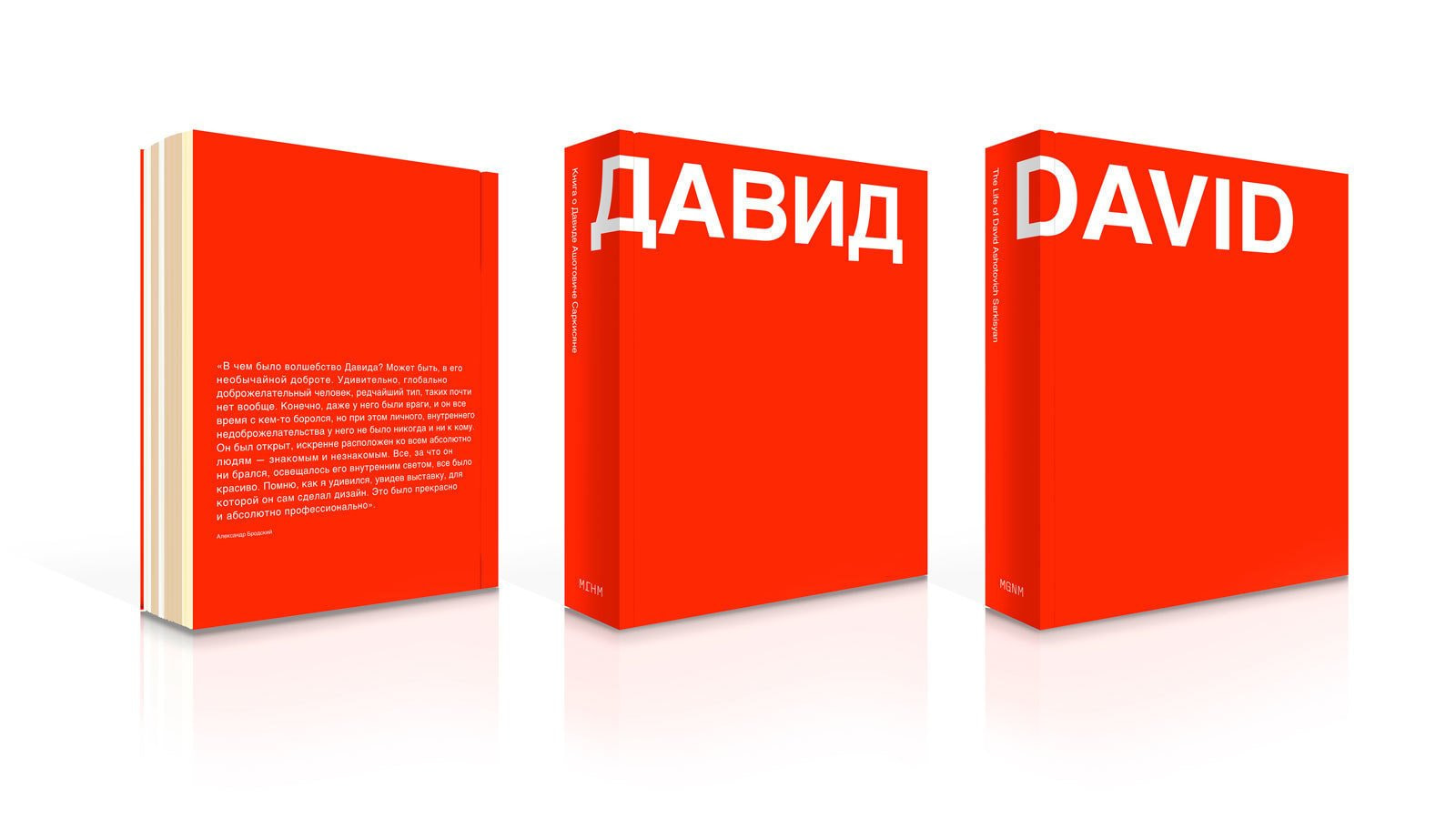 В книге «Давид» историю жизни Давида Саркисяна рассказывают его родные, друзья и коллеги: ученые, архитекторы, кураторы, режиссеры, художники, журналисты, искусствоведы и сотрудники музеев. Авторы монографии собрали подробную информацию о научных работах Давида Саркисяна и его выставочных проектах в Музее архитектуры.
